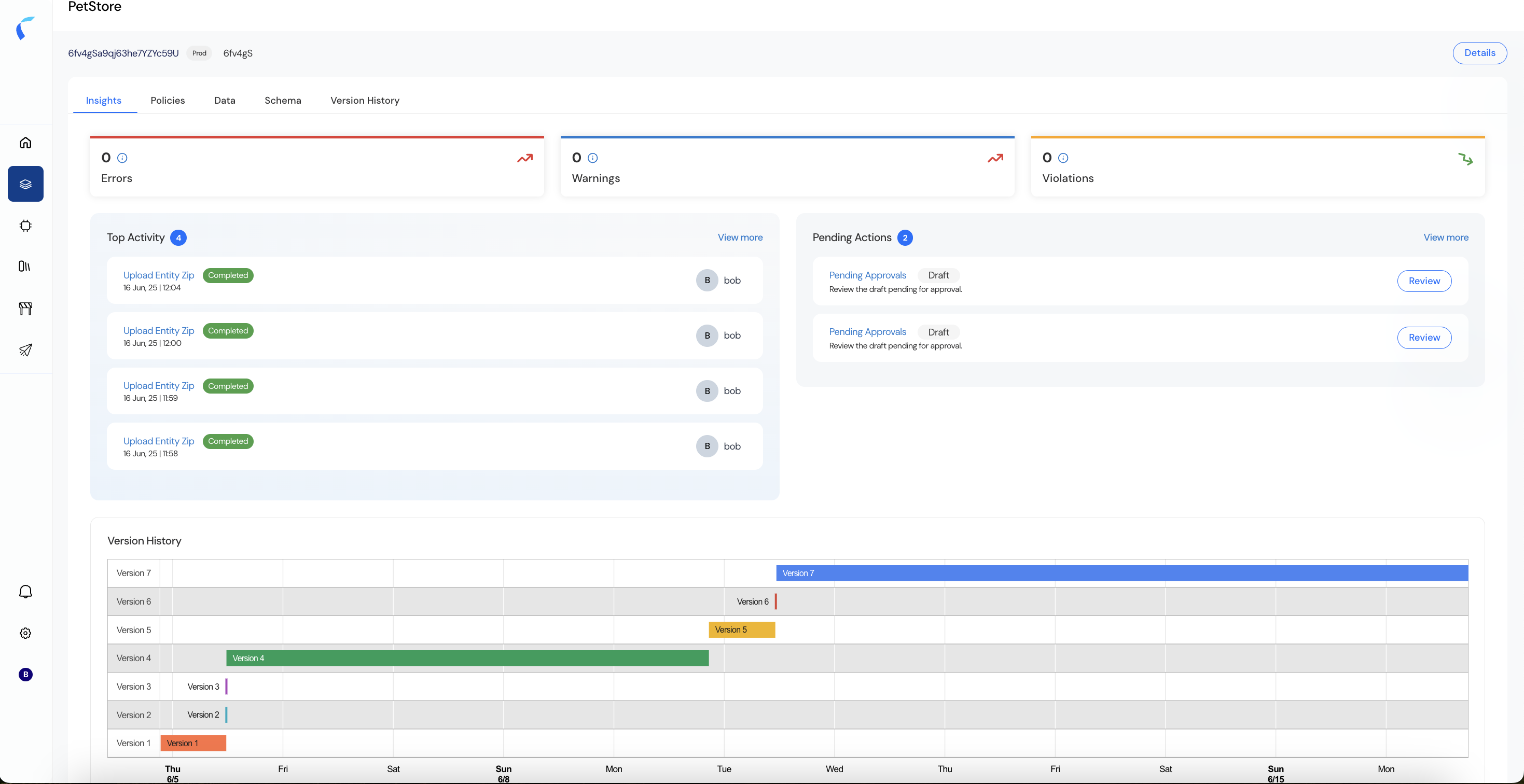- Pending Approvals: Lists draft changes waiting for governance team approval.