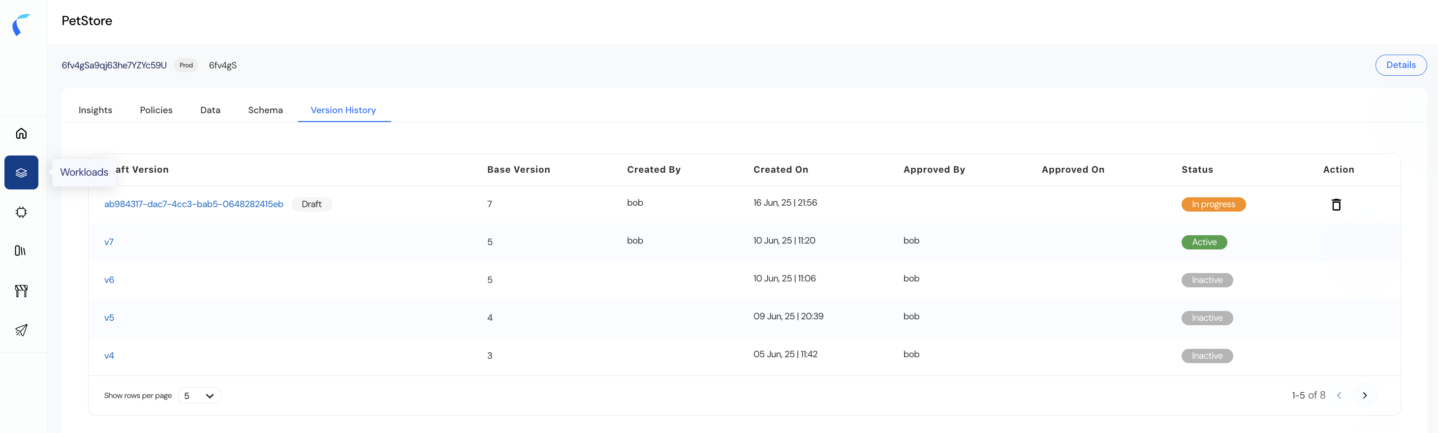 Version | The unique identifier for the policy version. Draft versions display a generated ID while approved versions follow sequential version numbers (e.g., v7, v6, v5, etc.). |