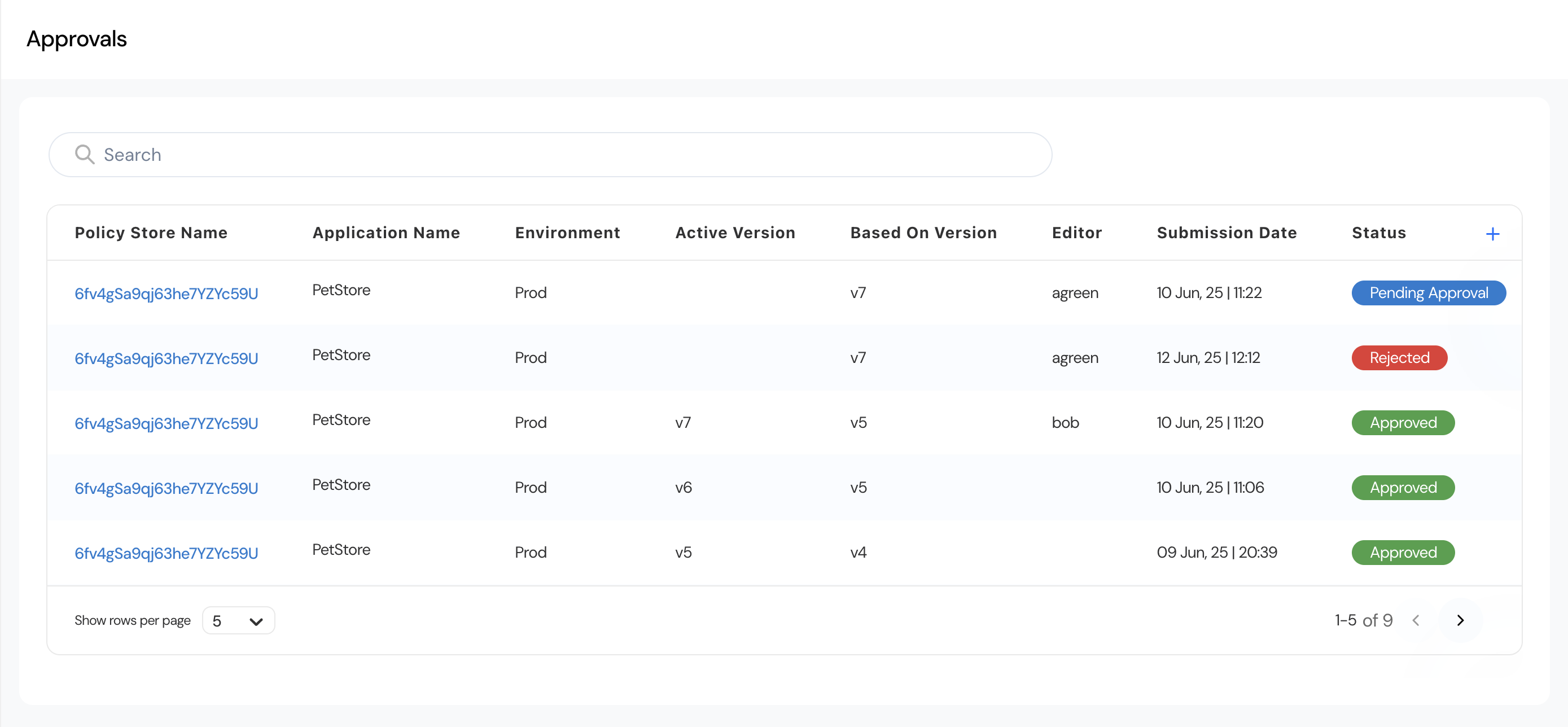 Submission Date | The date and time when the policy was submitted for approval (e.g., 10 Jun, 25 11:22 ). |